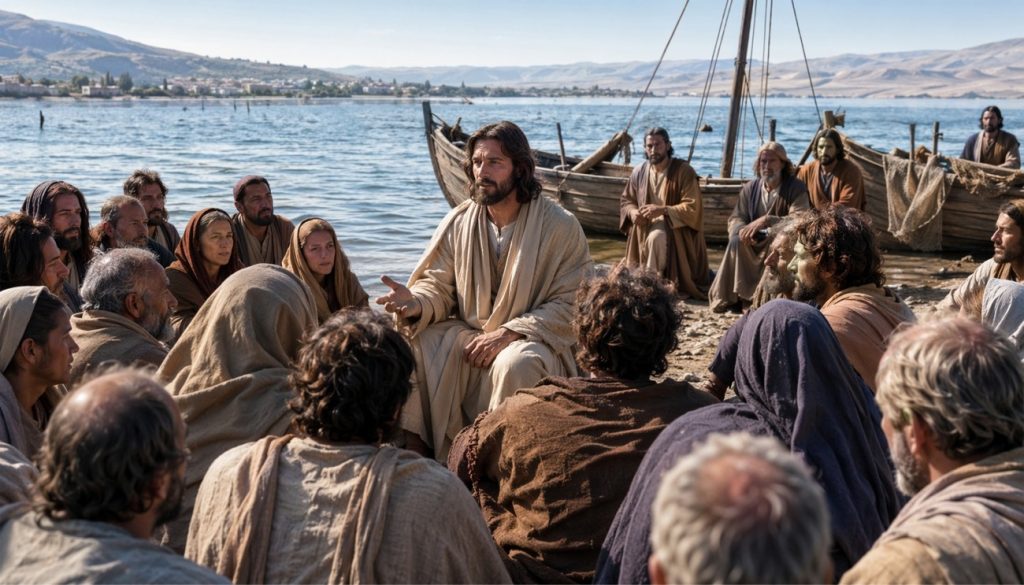 Después de que Jesús hubo saciado a cinco mil hombres, sus discípulos lo vieron caminando sobre el mar. Al día siguiente, la gente que se había quedado al otro lado del mar notó que allí no había habido más que una barca y que Jesús no había embarcado con sus discípulos, sino que sus discípulos se habían marchado solos.